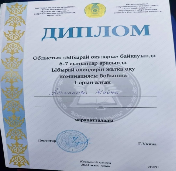 2023 жылдың 19 қазан күні облыстық "ЫБЫРАЙ оқулары" өтті. "ЫБЫРАЙ оқуларына" ауданнан 2-і номинация бойынша 2 оқушы қатысты. 6_7 сынып оқушылар 1-ші номинация бойынша "ЫБЫРАЙ өлеңдерін жатқа айтса", 8_9 сынып оқушылары 2-ші номинация бойынша "ЫБЫРАЙ әңгімелерін" жатқа айтты.Байқау қорытындысы бойынша: 6_7 сынып оқушылары арасынан "ЫБЫРАЙ өлеңдерін" жатқа айту номинациясы бойынша "Ы.Алтынсарин ЖББМ" 6 сынып оқушысы Алпысқызы Жайна І орын дипломымен марапатталады. 8_9 сынып оқушылары арасынан "ЫБЫРАЙ әңгімелері" номинациясы бойынша "Ы.Алтынсарин ЖББМ" 9 сынып оқушысы Ғалымжан Аружан қатысқаны үшін сертификат пен марапатталады.